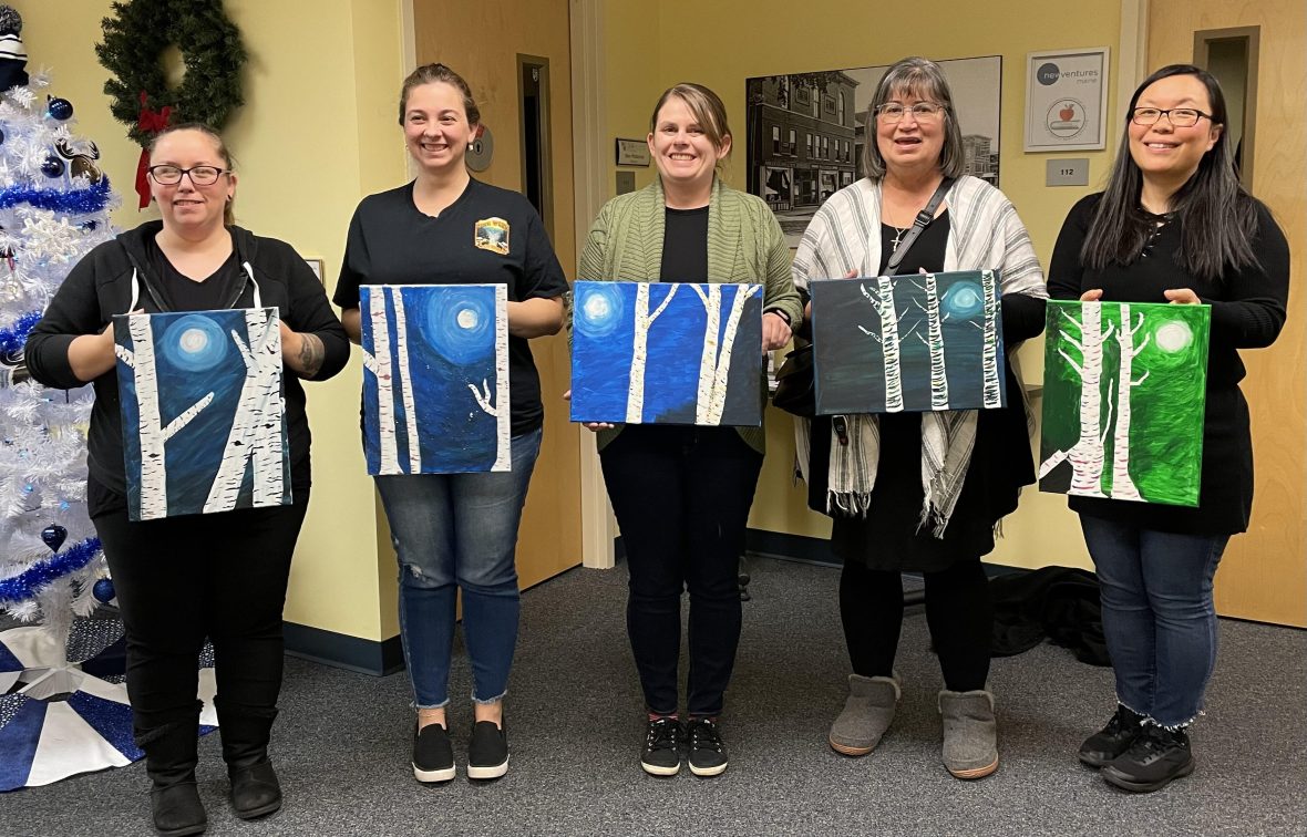 The artistic soirée took place at the Center, where students and their guests immersed themselves in the joy of painting “Birch in Winter.” Under the guidance of Elizabeth Daly, the dedicated Student Services Coordinator for the Center, participants explored their artistic talents and expressed themselves through brush strokes and vibrant colors.