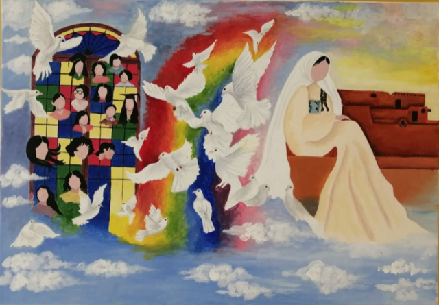 Parivash and Nasser Rohani founded a global education and art movement through social media entitled #OurStoryIsOne. The grass-roots, growing movement honors ten Bahá’í women who, after months of torture and imprisonment, were executed one by one in a square in Shiriaz, Iran because of their religious identities. Parivash’s personal experience fueled her desire to organize women around the world to express their anger, solidarity, courage and hope through visual and performing arts. The movement is powerful, the artwork arresting, and the demand for greater human rights in Iran and around the world clear.