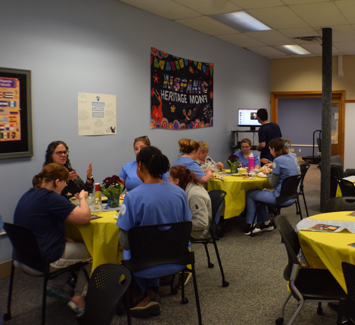 The UMA Ellsworth Center Student Association celebrated Hispanic Heritage month with a themed luncheon. President Cushman, community partners, Center staff and students enjoyed the celebration. The luncheon included tacos with an assortment of chicken, beef, vegetable toppings, rice, and beans as well as churros for dessert. Participants that completed a short Hispanic Heritage Trivia Quiz were able to choose a woven braided friendship bracelet. It was a great way for folks to come together, share a meal, and talk outside of the classroom.