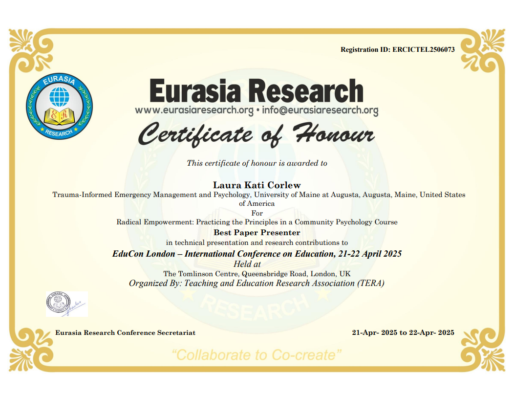 UMA’s own Katie Corlew was recognized as the best paper presenter at EduCon London – International Conference on Education. The certificate below reads: