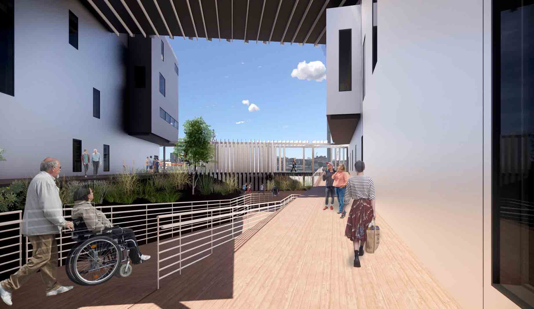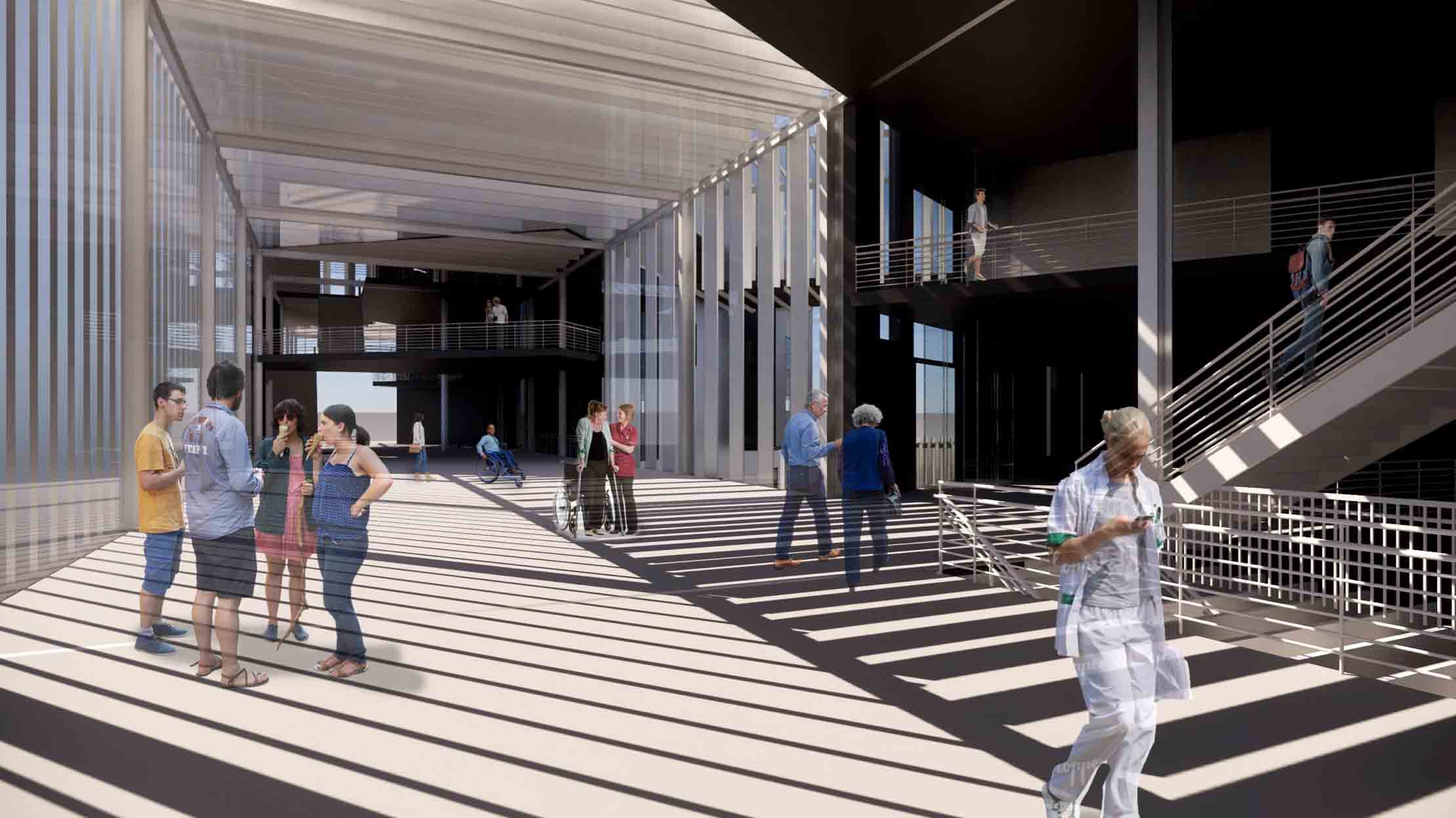 Cyr’s project, Distribution, Charlestown, was for a two-building medical office with labs and office suites in Charlestown, MA. Given the buildings location near the shorefront, her design took into account the need to accommodate for rising sea levels in years to come and the need for the building components to integrate, yet still connect if divided by water.