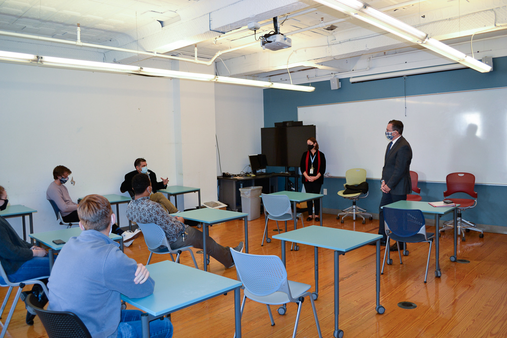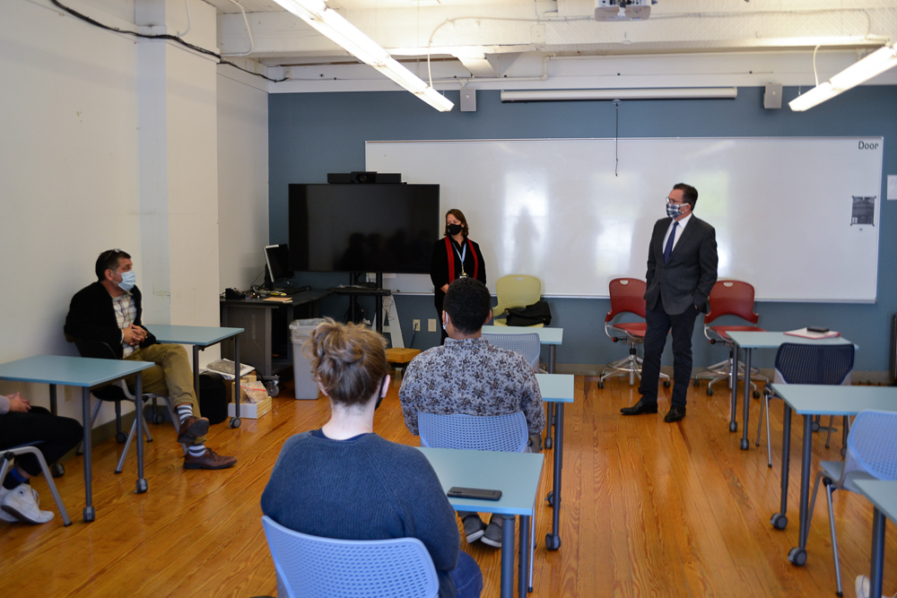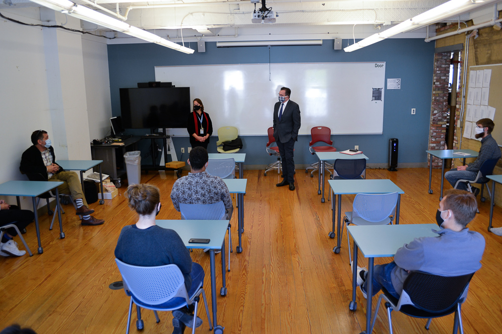 On October 15, Chancellor Dannel Malloy and President Rebecca Wyke visited with the 4th-year cohort in UMA’s Bachelor of Architecture Program that is taking a hybrid/flex class. As part of their course, the students are working on an affordable housing project in partnership with the Maine State and Augusta Housing Authorities.